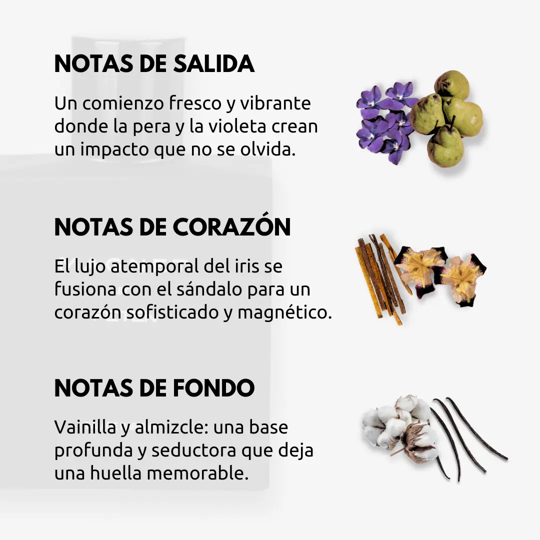– Extracto de pera y violeta: Aportan una apertura fresca y energizante para capturar la atención desde el primer momento